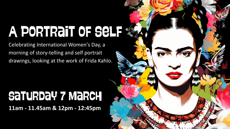 Celebrating International Women's Day, a morning of story-telling and self portrait drawings, looking at the work of Frida Kahlo.